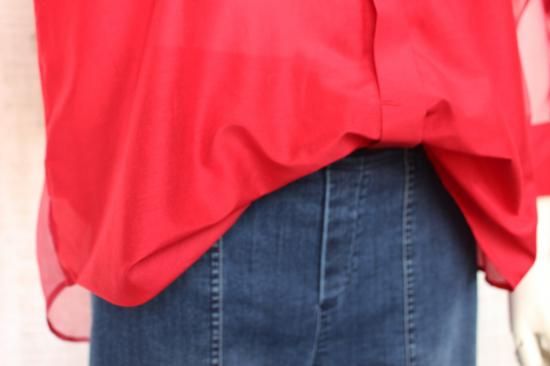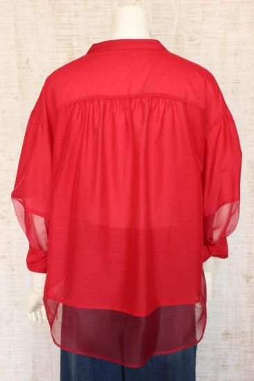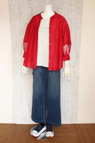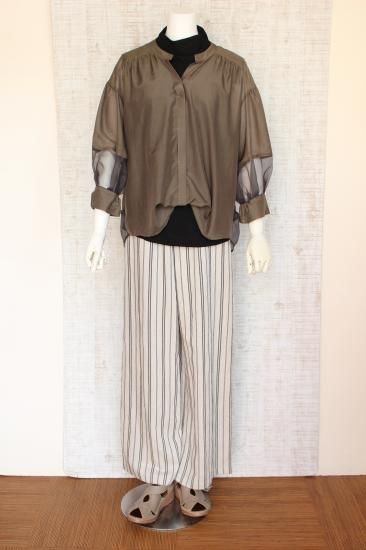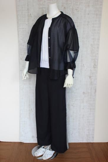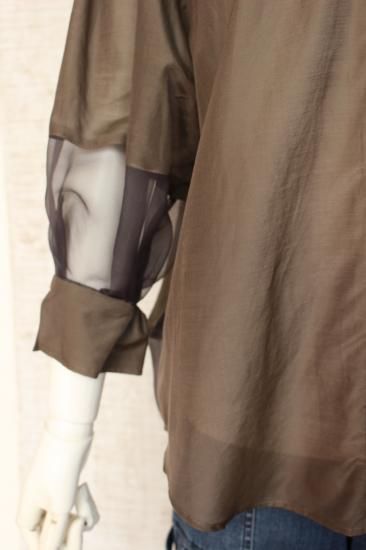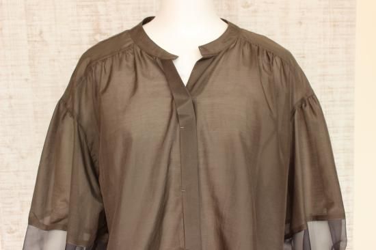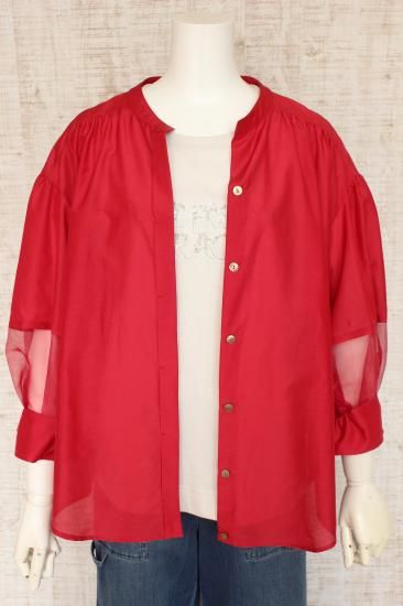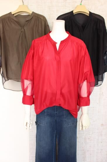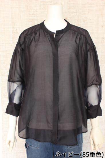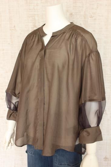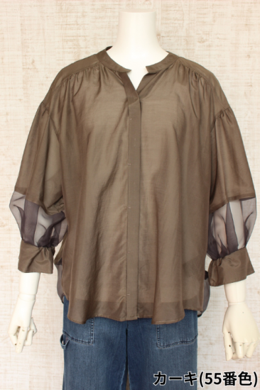 *商品説明*本体生地と透けるシフォン生地の組み合わせがオシャレです。インナーをお色合わせして着こなすと素敵です。袖口切り替え幅6.5cm 袖口スリット5.5cm 前比翼仕立てボタン6個 前裾丈スナップで調節OK