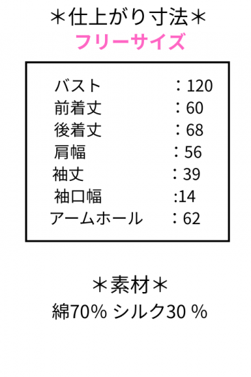 *仕上がり寸法*バスト120 着丈68 肩幅56 袖丈39 袖口幅14 アームホール62