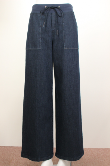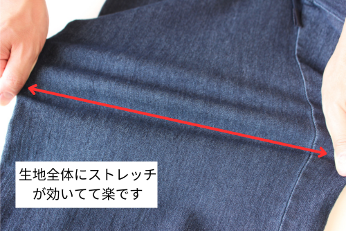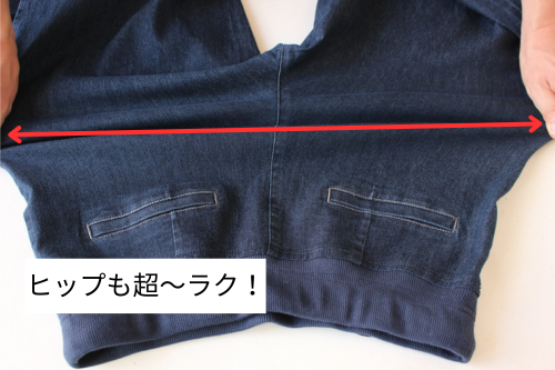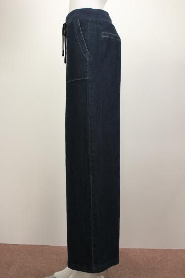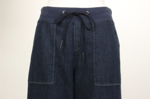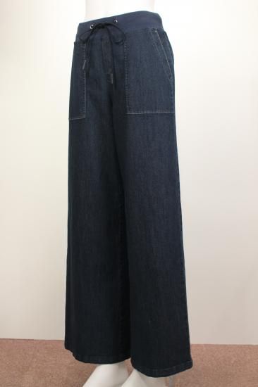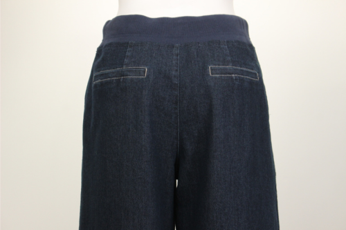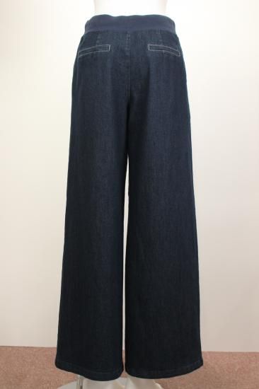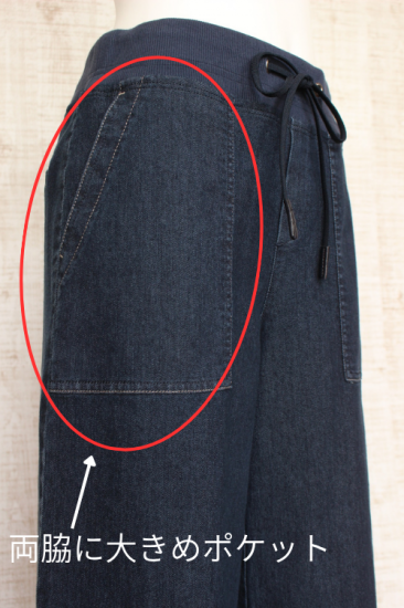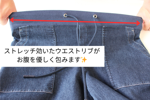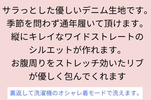 優しく履き心地のよいやわらかデニム生地です。季節を問わず通年履いて頂けます。根強い人気のワイドストレートシルエット。ウエストはゴムのリブでお腹周りラクラク。生地全体にストレッチが効いて動きやすいです。