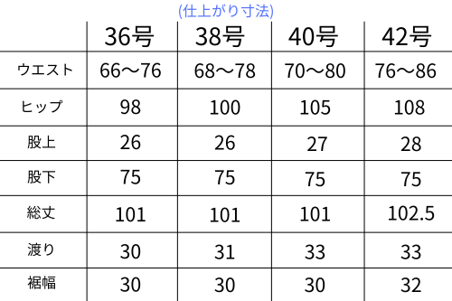 42号:ウエスト76〜86 ヒップ108 股上28 股下75 総丈102.5 渡り33 裾幅32