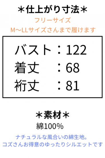 可愛いフェルトのコズさんオリジナル刺しゅう。ゆったりと着やすいシルエットです。羽織の下に着こんで、刺しゅうを見せると可愛くオシャレです。ナチュラルな風合いの綿100%の生地です。