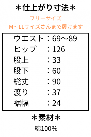 ウエスト69〜89 ヒップ126 股上33 股下60 総丈90 渡り37 裾幅24