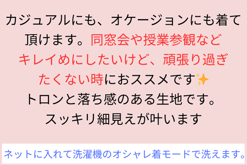 カジュアルからオケージョンシーンにも着て頂けます。同窓会や授業参観など、キレイめにしたいけど頑張りすぎたくない時におススメ!程よくゆったりシルエットで、M〜LLサイズさんまで着て頂けます。トロンとした質感の生地です。縦のラインをキレイに見せてくれますよ。