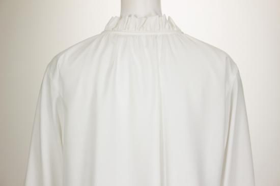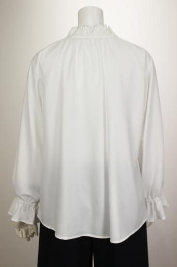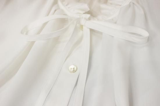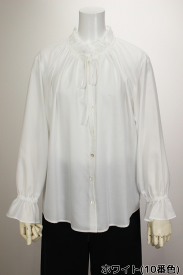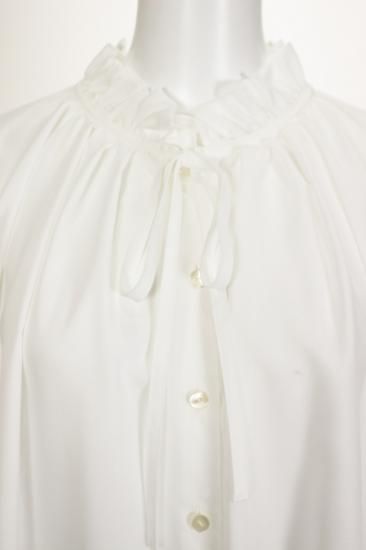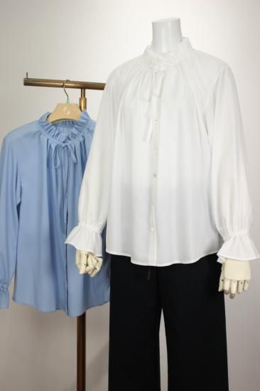 フリルとリボンのデザインが大人可愛いブラウスです。キレイめに決めたい時におススメ!冬はニット等の下に着こんで重ね着コーデがおススメ。