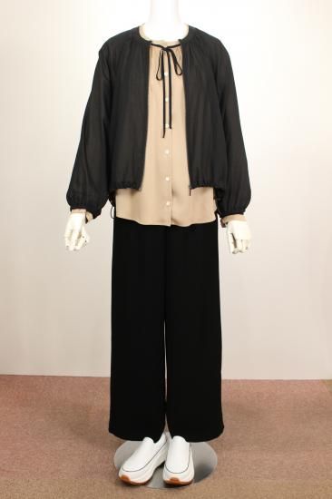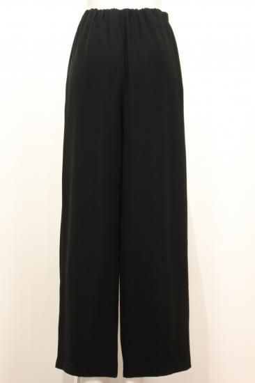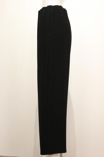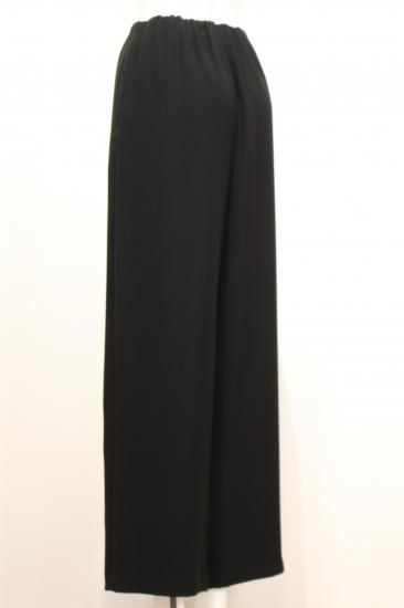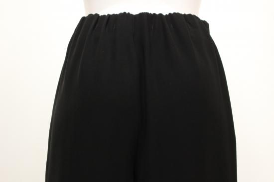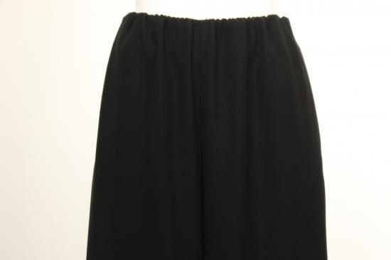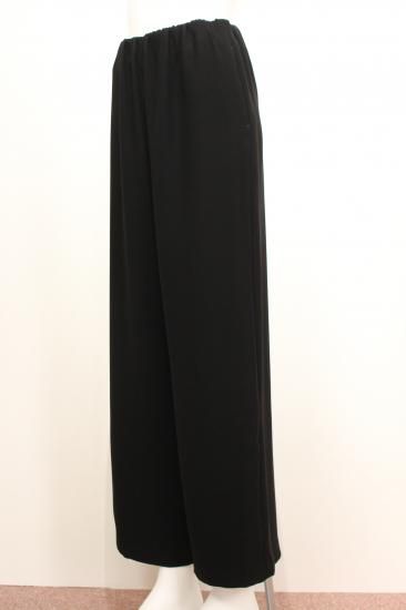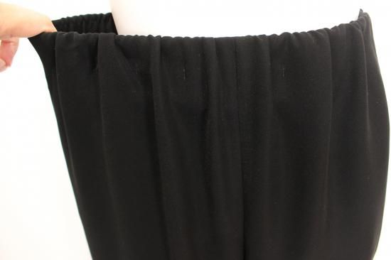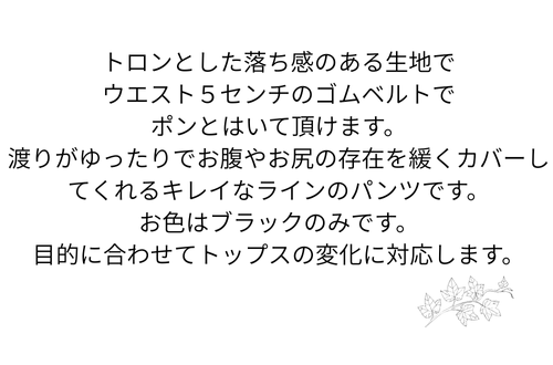 トロンとした落ち感のある生地でウエスト5センチのゴムベルトでポンとはいて頂けます。渡りがゆったりでお腹やお尻の存在を緩くカバーしてくれるシルエットキレイなパンツです。ブラックのみです。目的に合わせてトップスの変化に対応します。