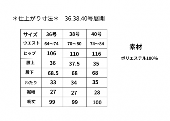 36号 ウエスト64~74 ヒップ106 股上36 股下68 渡り幅33 裾幅27 総丈99