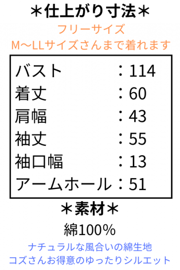 バスト114 着丈60 肩幅43 袖丈55 袖口幅13 アームホール51