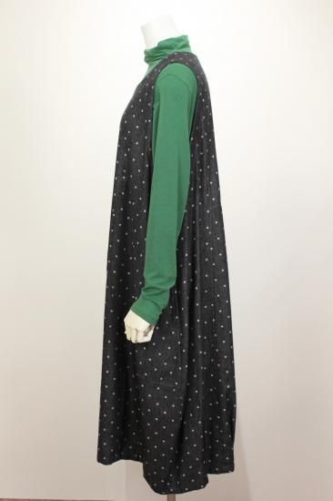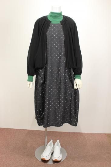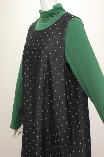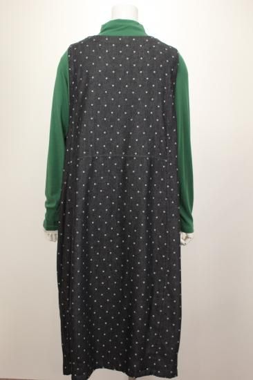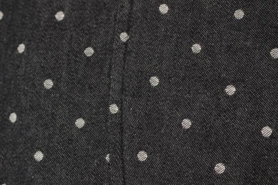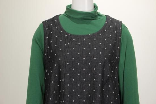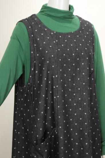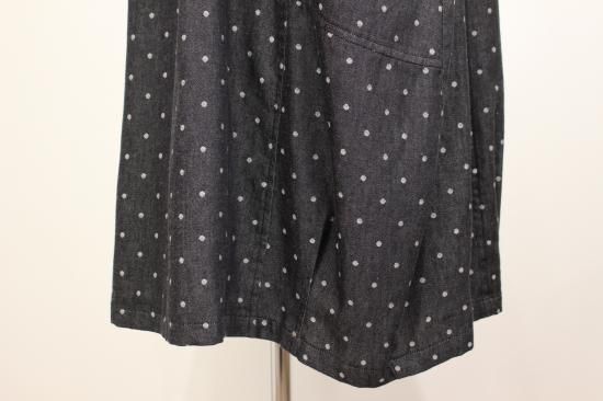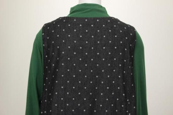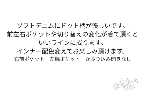 身幅ゆったり、ソフトデニムにドット柄が優しいです。前左右ポケットや切り替えの変化が着て頂くといいラインに成ります。インナー配色変えてお楽しみ頂けます。右前ポケット 左脇ポケット かぶり込み開きなし