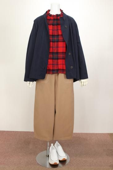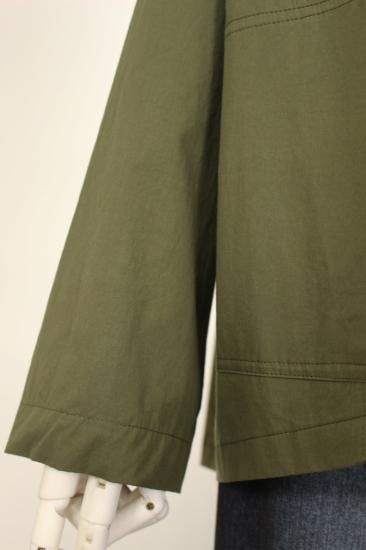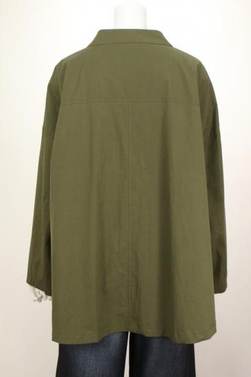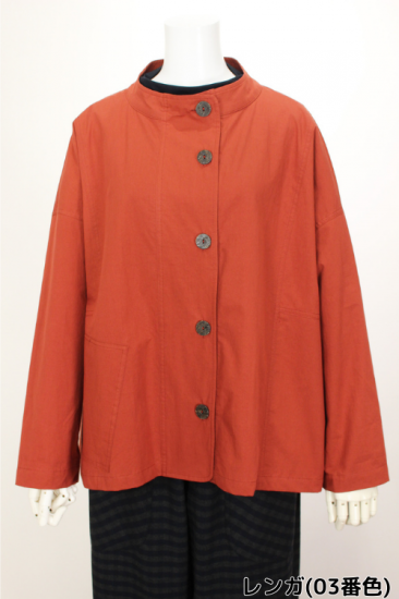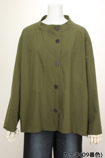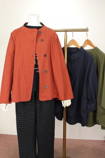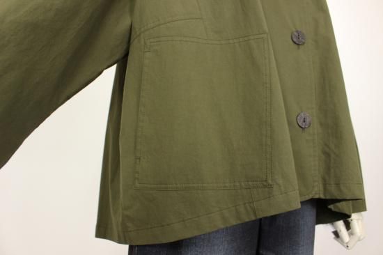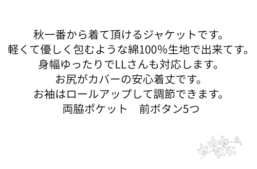 秋一番から着て頂けるジャケットです。軽くて優しく包むような綿100%生地で出来てます。身幅ゆったりでLLさんも対応します。お尻がカバーでいる安心着丈です。お袖はロールアップして調節できます。両脇ポケット 前ボタン5つ