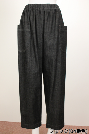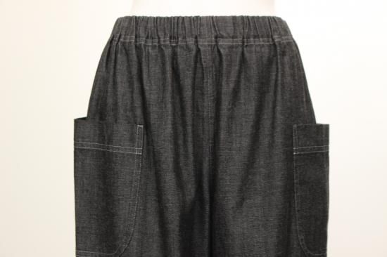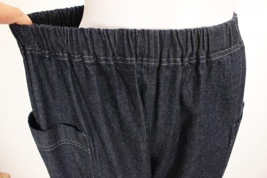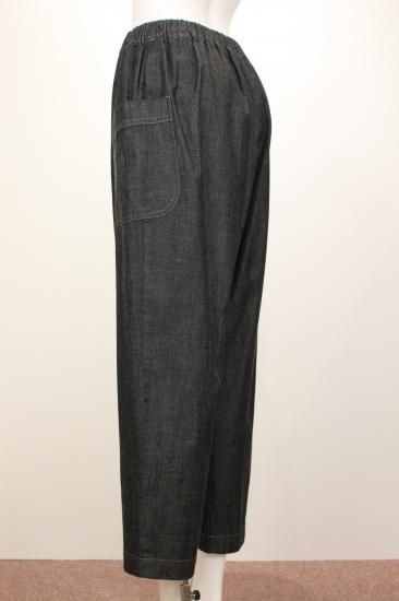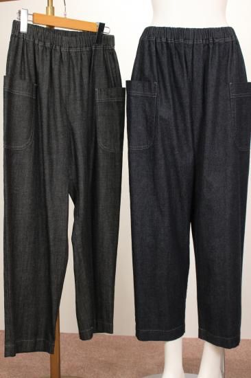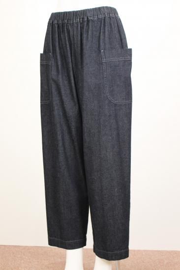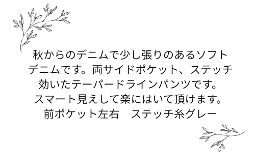 秋からのデニムで少し張りのあるソフトデニムです。両サイドポケット、ステッチ効いたテーパードラインパンツです。スマート見えして楽にはいて頂けます。前ポケット左右 ステッチ糸グレー