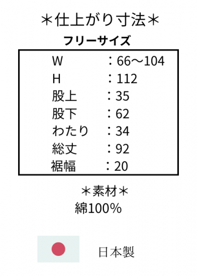 *仕上がり寸法*ウエスト66~104 ヒップ112 股上35 股下62 渡り幅34 裾幅20 総92