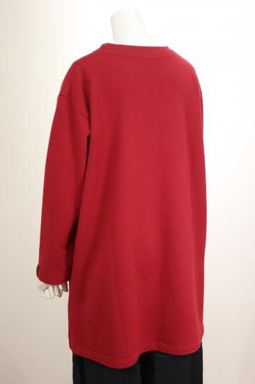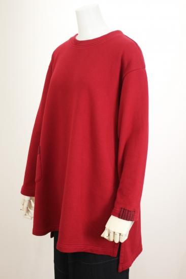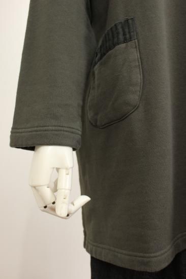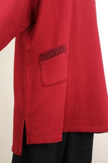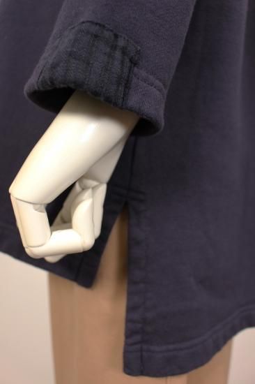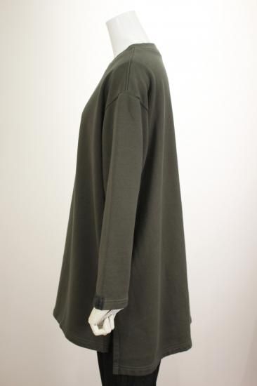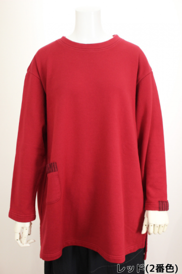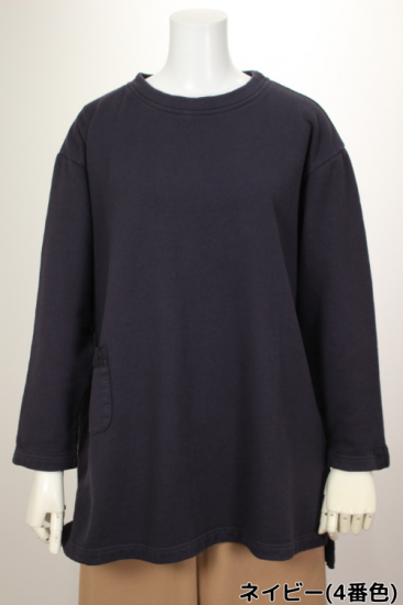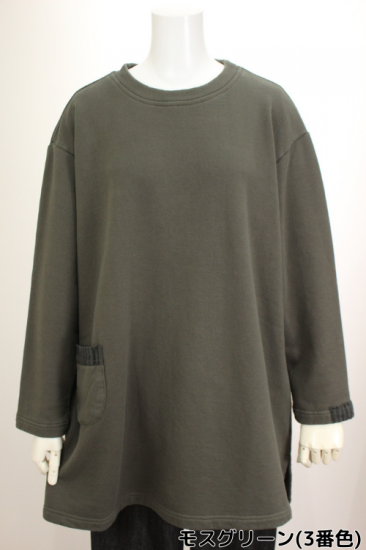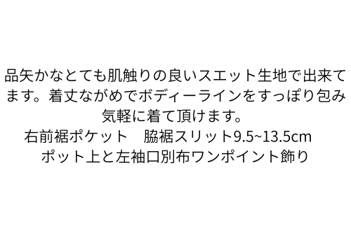 しなやかなとても肌触りの良いスエット生地で出来てます。着丈ながめでボディーラインをすっぽり包み気軽に着て頂けます。右前裾ポケット 脇裾スリット9.5~13.5cm ポット上と左袖口別布ワンポイント飾り