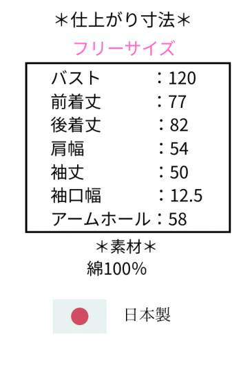 *仕上がり寸法*バスト120 着丈前77後82 肩幅54 袖丈50 袖口幅12.5 アームホール58