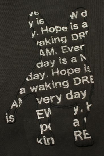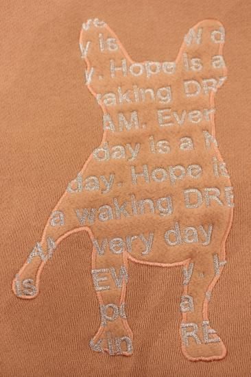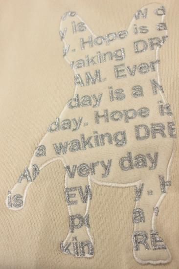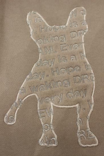 脇部分シャーリングゴム入り 袖下部分と脇部分起毛 両脇から繋がるポケット一つ 犬シルエットのラメ刺しゅう