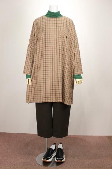 バスト幅158センチの超ゆったり楽チンな着心地です。縦にストンと落ちるシルエットで、着ぶくれしません。落ち着いたコーデ合わせしやすいチェック柄チュニックです。