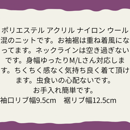 ポリエステル アクリル ナイロン ウール混のニットです。お袖裾は重ね着風になってます。ネックラインはキュッと空き過ぎないです。身幅ゆったりM/Lさん対応します。ちくちく感なく気持ち良く着て頂けます。虫食いの心配ないです。お手入れ簡単です。袖口リブ幅9.5cm 裾リブ幅12.5cm