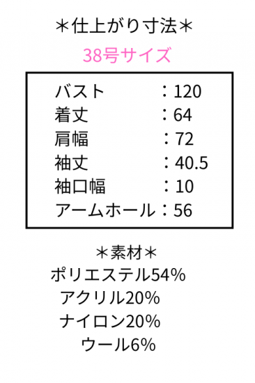 バスト120 着丈64 肩幅72 袖丈40.5 袖口幅10 アームホール56