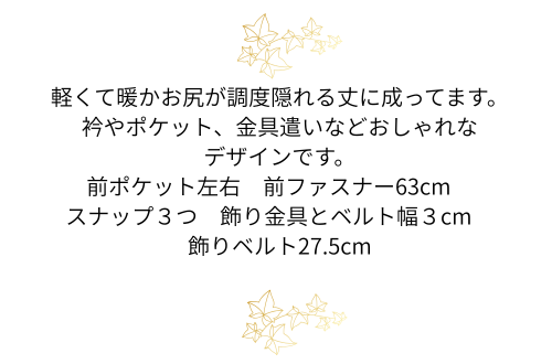 軽くて暖かお尻が調度隠れる丈に成ってます。衿やポケット、金具遣いなどおしゃれなデザインです。