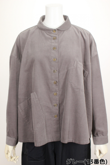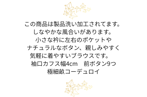 この商品は製品洗い加工されてます。のでしなやかな風合いがあります。小さな衿に左右のポケットやナチュラルなボタンなど親しみやすく気軽に着やすいブラウスです。左胸ポケット 右前ポケット 袖口カフス幅4cm 前ボタン9つ 極細畝コーデュロイ
