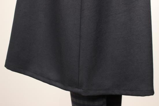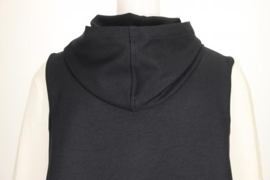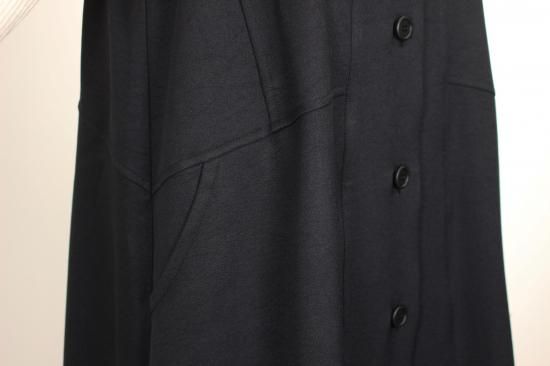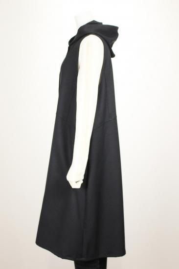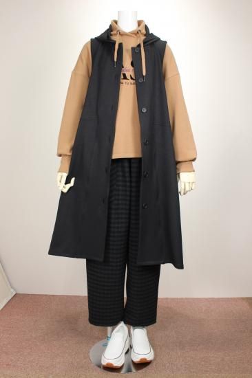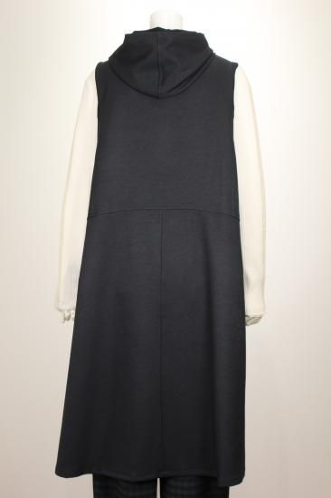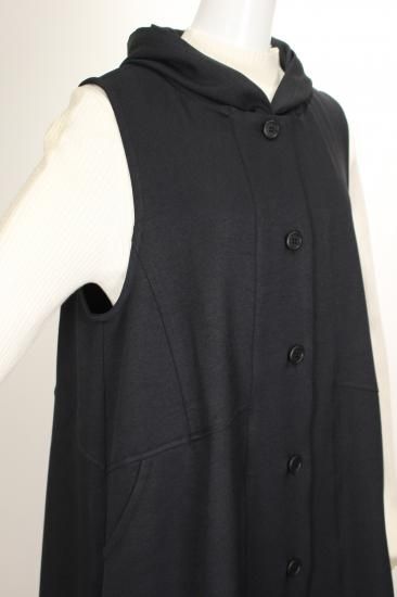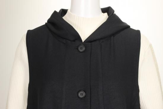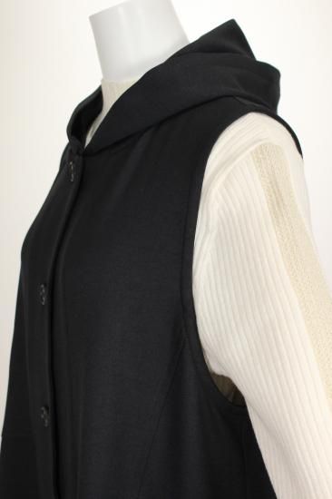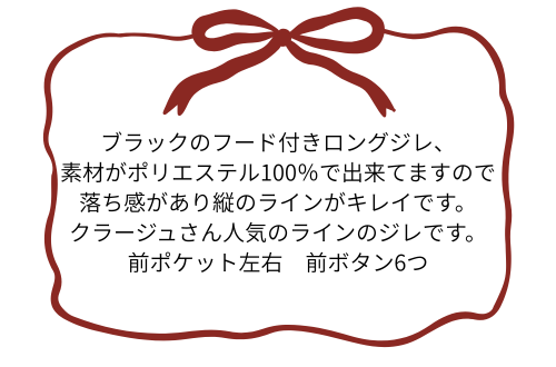 ブラックのフード付きロングジレです。素材がポリエステル100%で出来てますので縦のラインがキレイです。クラージュさんの人気ラインです。前ポケット左右 前ボタン6つ