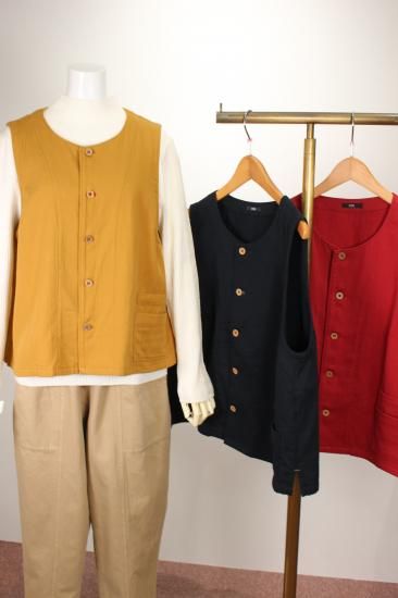 コットンツイルの柔らかくて少し厚みのある綿100%の生地で出来てます。前ボタン5個ポケット前左に重なるように二段になって付いてます。後ろは右に一個可愛い赤のボタンホールにボタン付きの楽しいデザインです。 脇裾スリット5.5cm