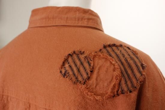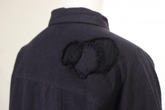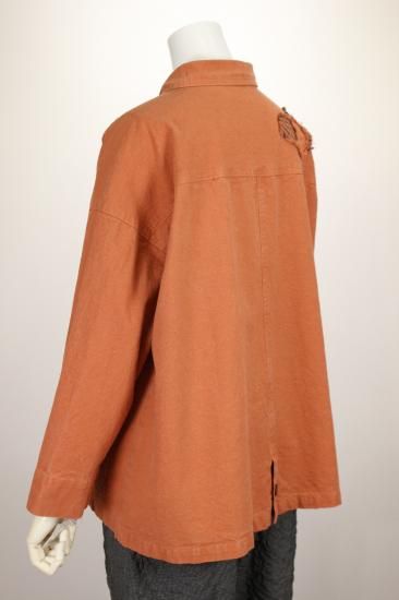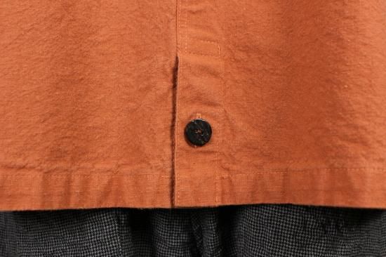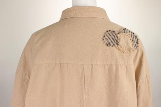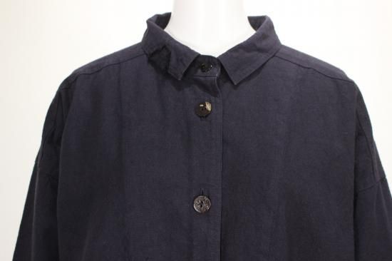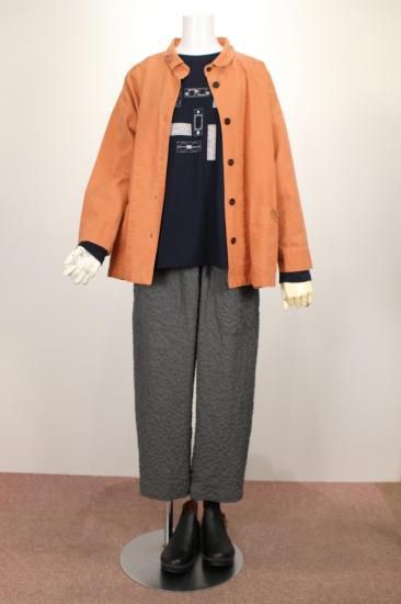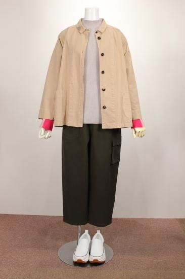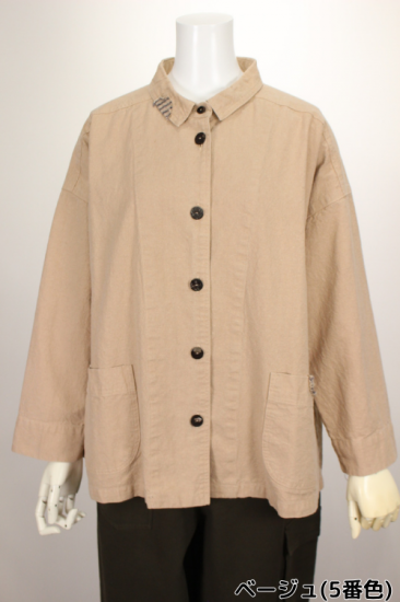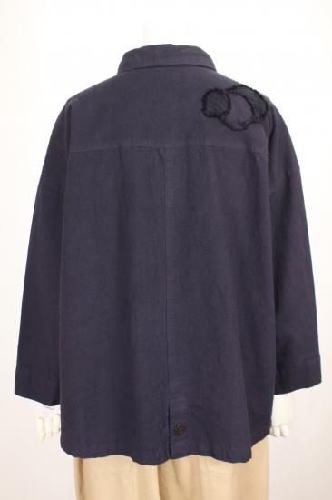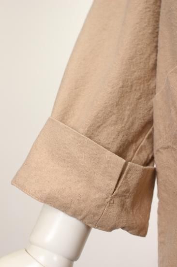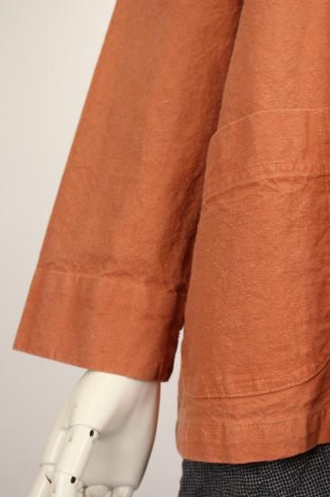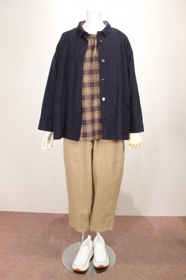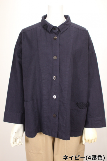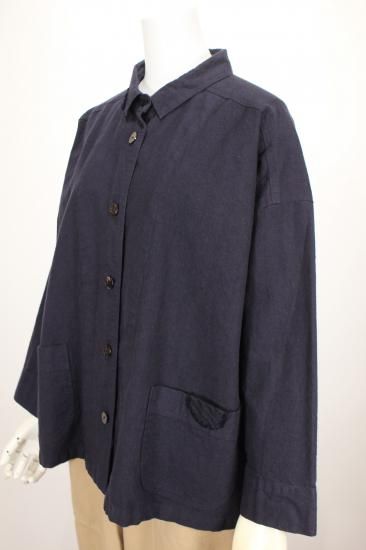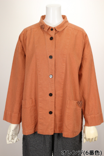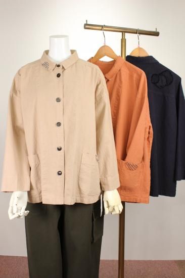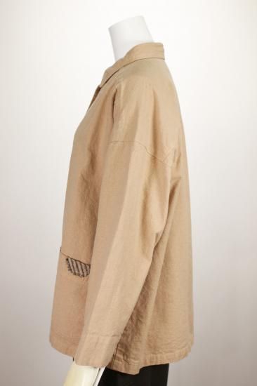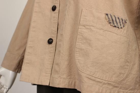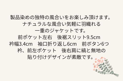 製品染めの独特の風合いをお楽しみ頂けます。ナチュラルな風合い気軽に羽織れる一重のジャケットです。前ポケット左右 後裾スリット9.5cm 衿幅3.4cm 袖口折り返し6cm 前ボタン6つ 衿、前左ポケット 後右肩に縞と無地の貼り付けデザインが素敵です。