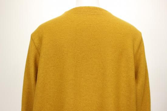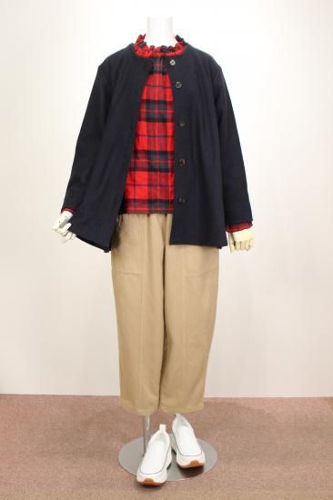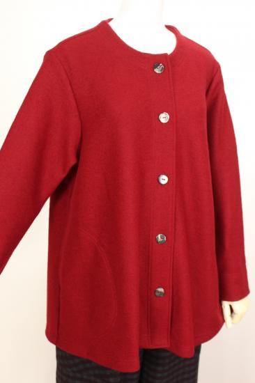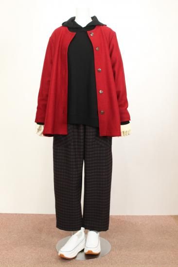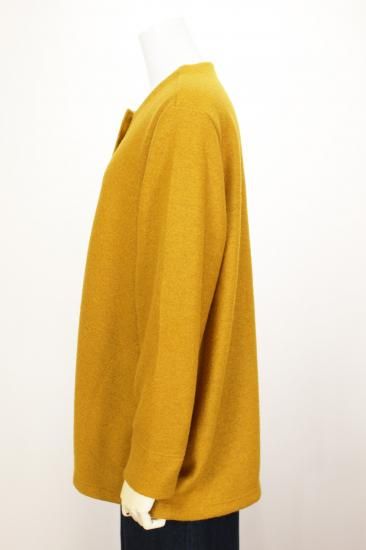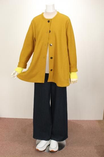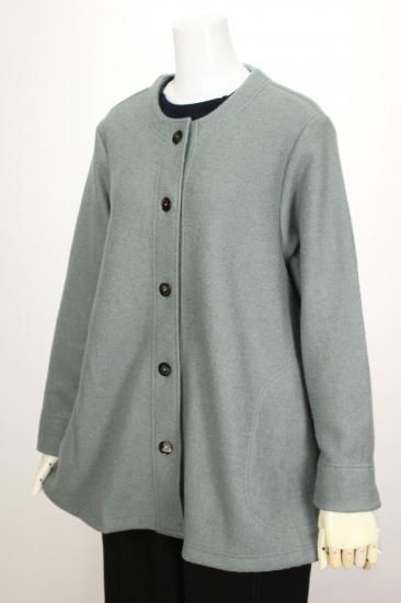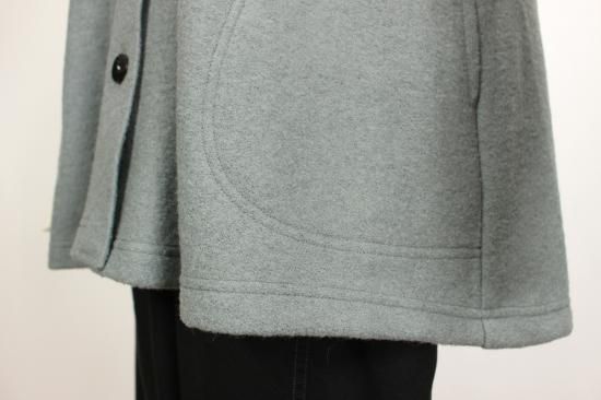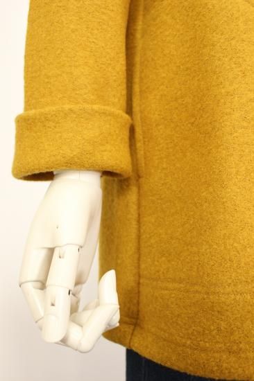 圧縮ウールの丈夫で柔らかい生地です。衿元スッキリノーカラーで、ハイネックやフード付きのインナーと合わせやすいです。ゆったりシルエットで動きやすく快適なアウターです。