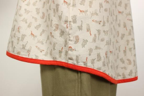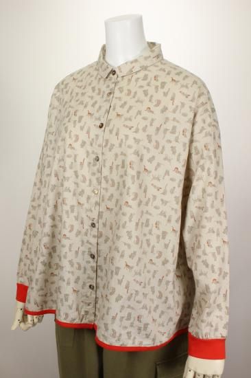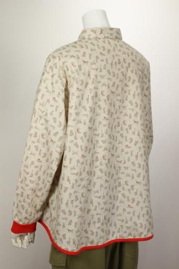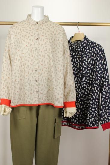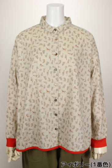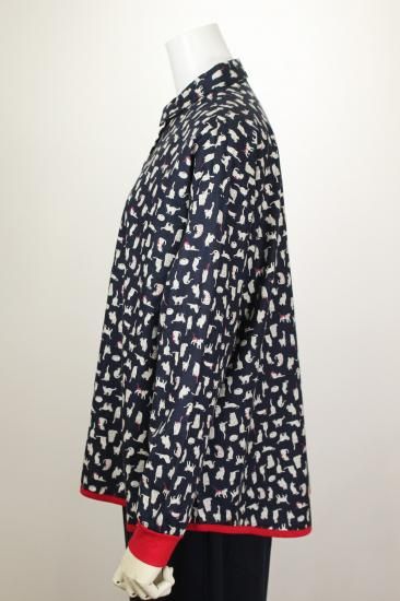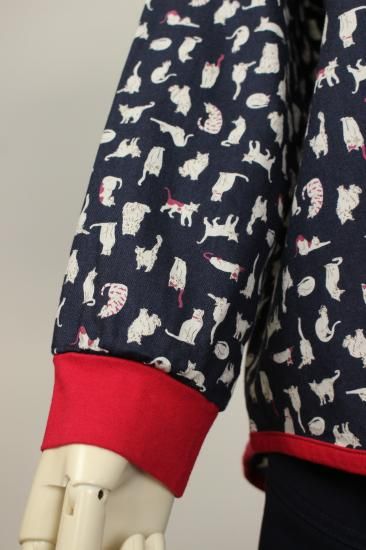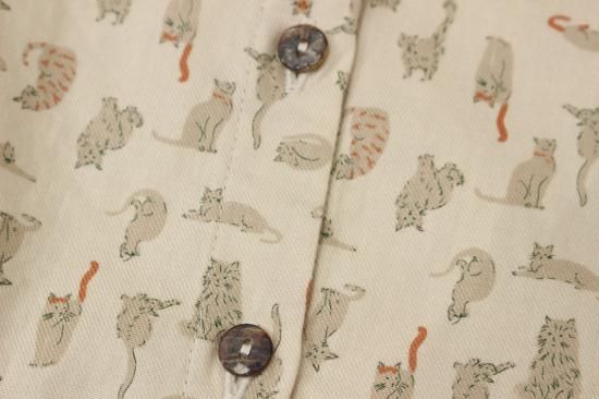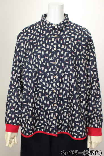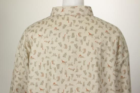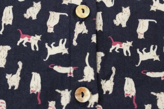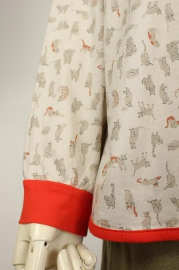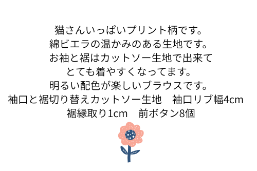 猫さんいっぱいプリント柄です。綿ビエラの温かみのある生地です。お袖と裾はカットソー生地で出来てとても着やすくなってます。明るい配色が楽しいブラウスです。袖口と裾切り替えカットソー生地 袖口リブ幅4cm 裾縁取り1cm 前ボタン8個