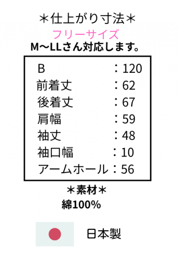*仕上がり寸法*バスト120 着丈前62後67 肩幅59 袖丈48 袖口幅10 アームホール56