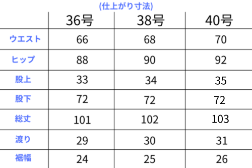 ウエスト:68 ヒップ:90 股上:34 股下:72 総丈:102 渡り幅:30 裾幅:25