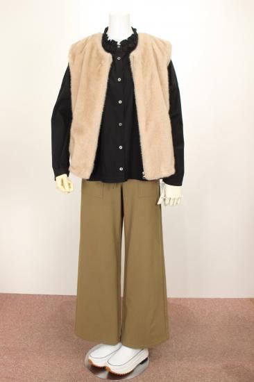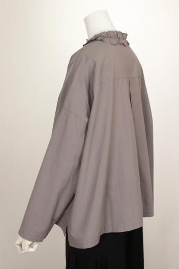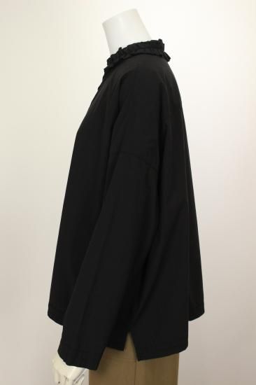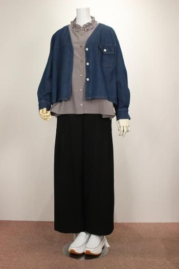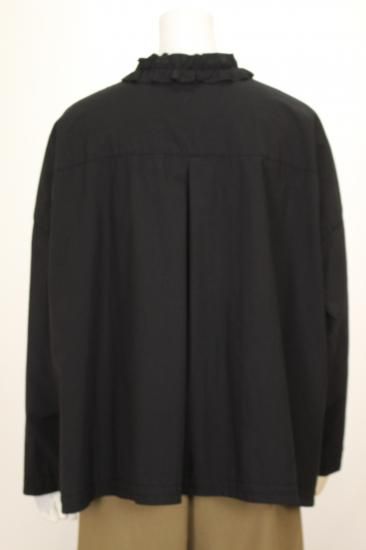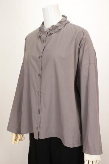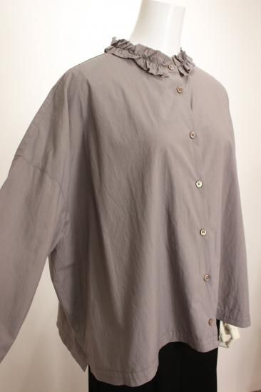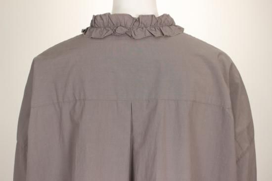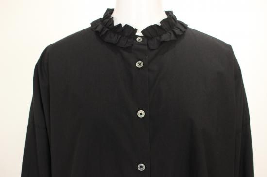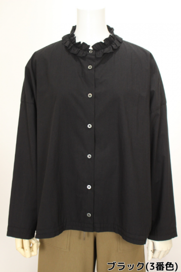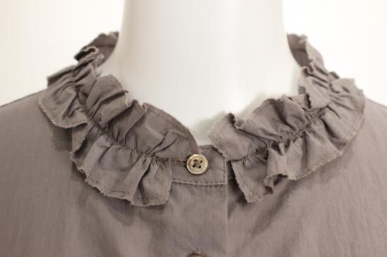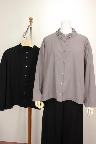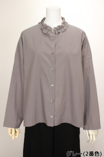 サラっと快適な綿生地。年間通して着て頂ける生地です。衿元のフリルデザインがとても可愛い一着。大人の可愛めブラウスです。