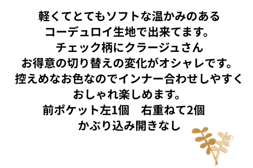 軽くてとてもソフトな温かみのあるコーデュロイ生地で出来てます。チェック柄にクラージュさんお得意の切り替えの変化がオシャレです。控えめなお色なのでインナー合わせしやすくおしゃれ楽しめます。前ポケット左×1 右×2 かぶり込み開きなし