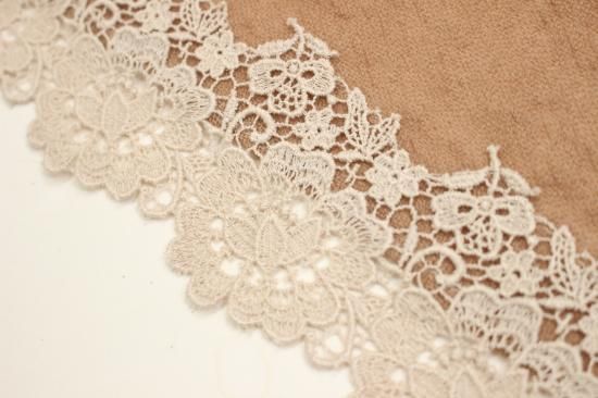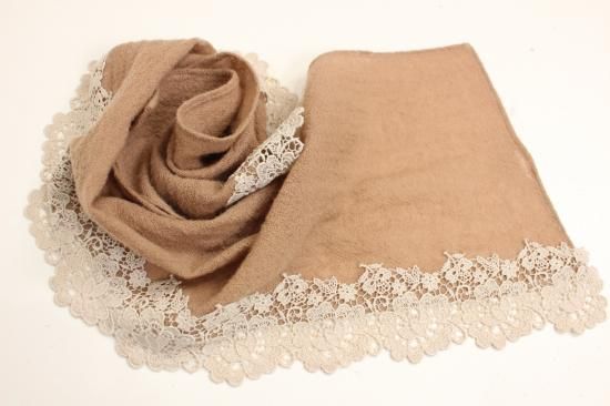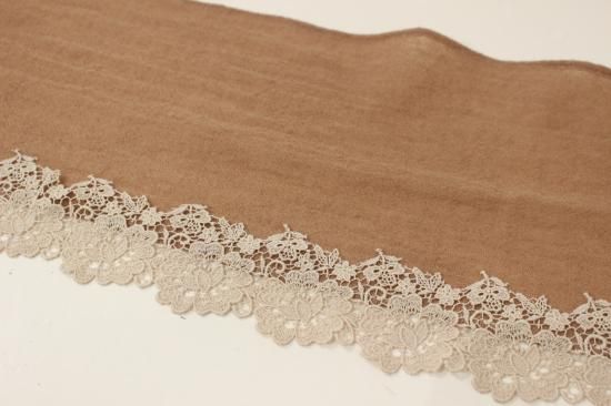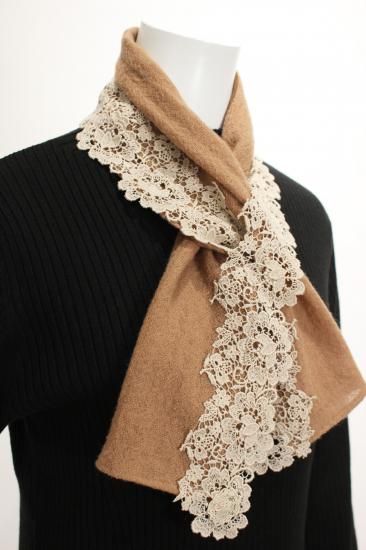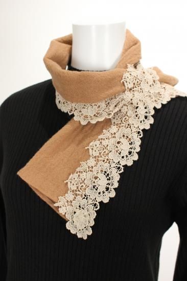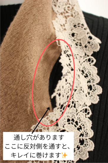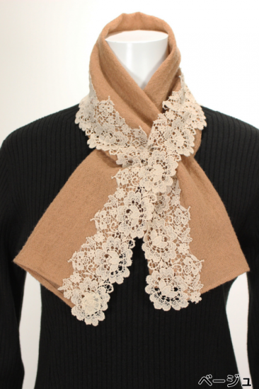 キレイなレースがコーデに上品さをプラスしてくれます。無地部分はウールです。しっかり暖かさ感じます。通し穴が付いているので、簡単に巻けます。