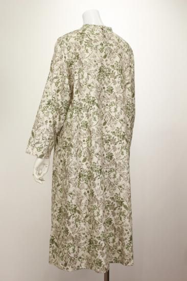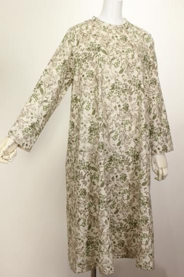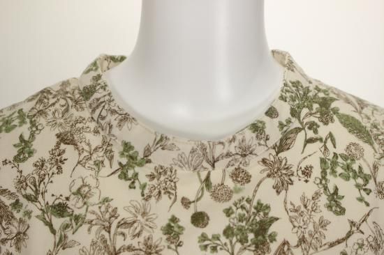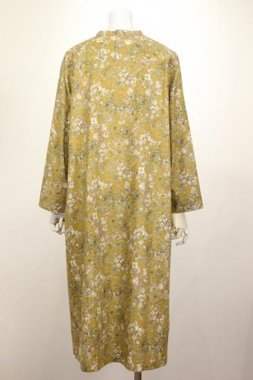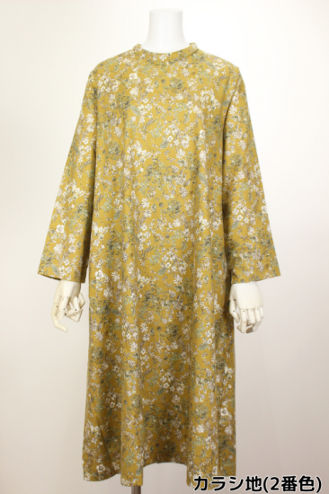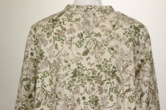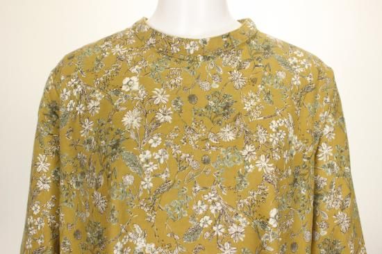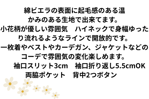 綿ビエラの表面に起毛感のある温かみのある生地で出来てます。小花柄が優しい雰囲気 ハイネックで身幅ゆったり流れるようなラインで開放的です。一枚着やベストやカーデガン、ジャケットなどのコーデで雰囲気の変化楽しめます。袖口スリット3cm 袖口折り返し5.5cmOK 両脇ポケット 背中2つボタン