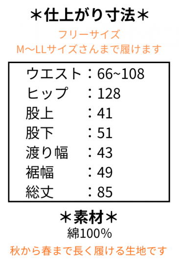 ウエスト:66~108 ヒップ:128 股上:41 股下:51 渡り幅:43 裾幅:49 総丈:85