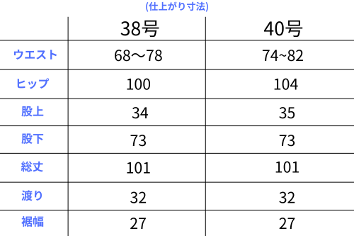 38号 ウエスト:68~78 ヒップ:100 股上:34 股下:73 渡り幅:32 裾幅:27 総丈:101