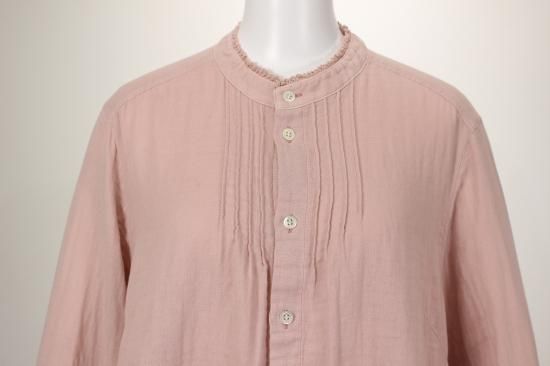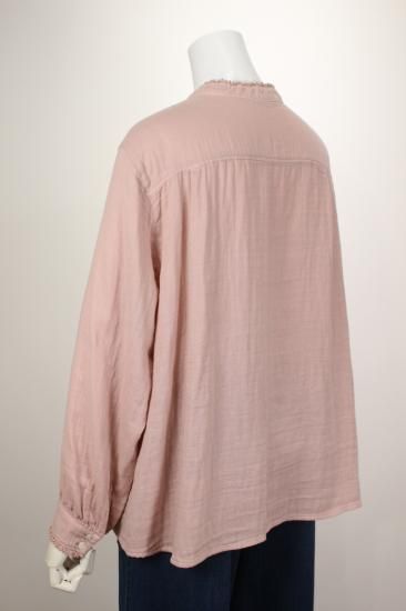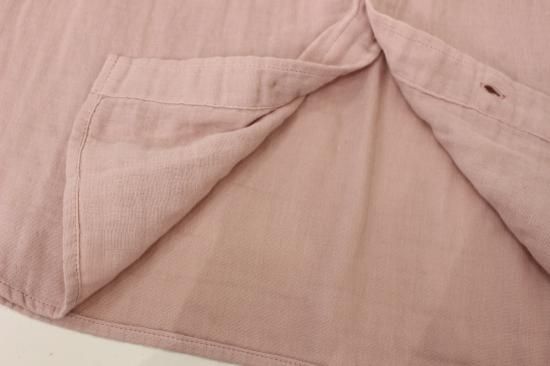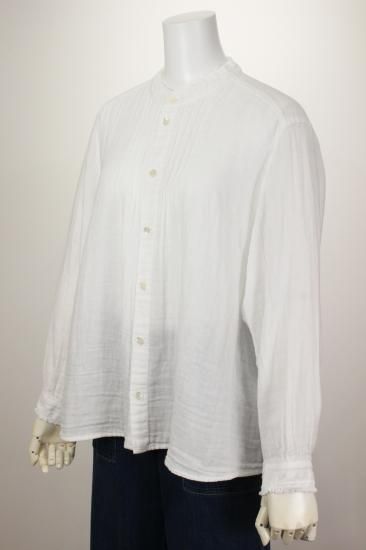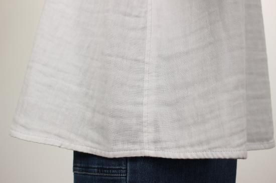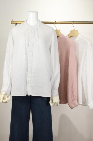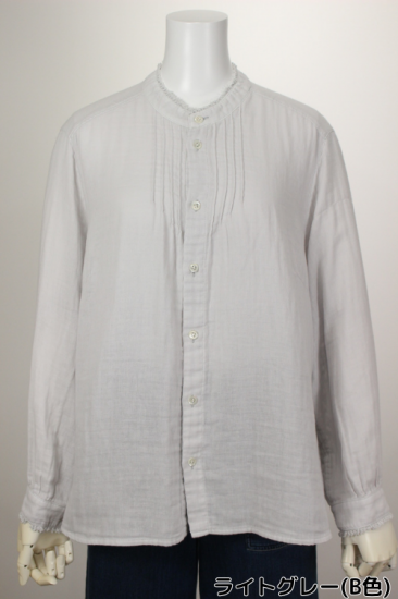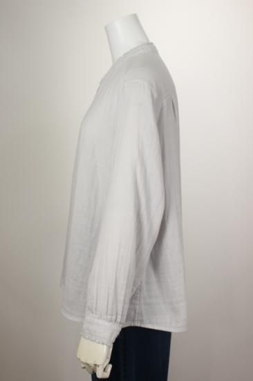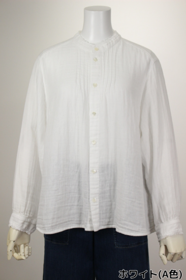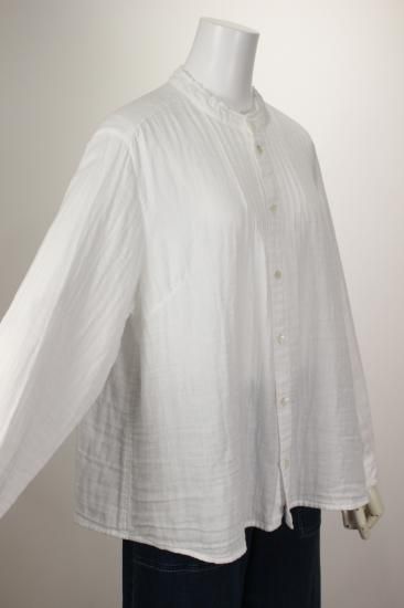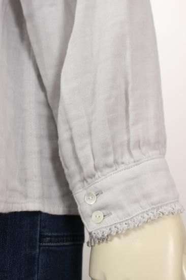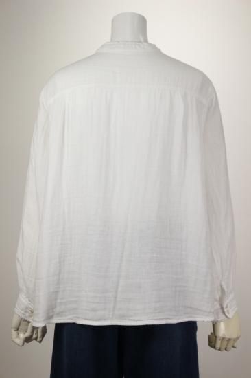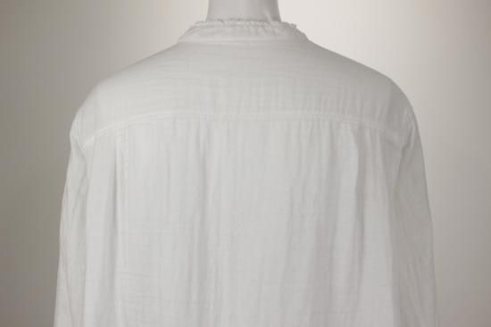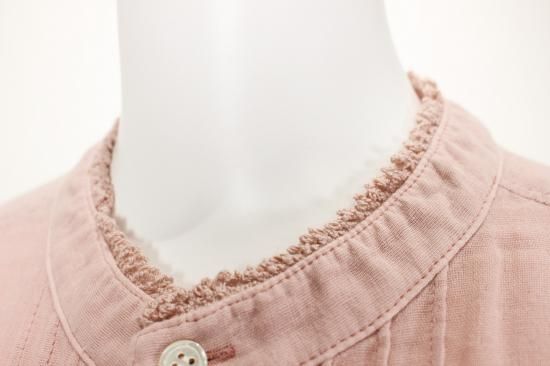 ふんわり優しい肌触りの綿ガーゼ生地です。衿元、お袖の小さめフリルが上品で可愛いデザイン。カットソーやニットを重ね着して、下からフリルを見せるとオシャレです。