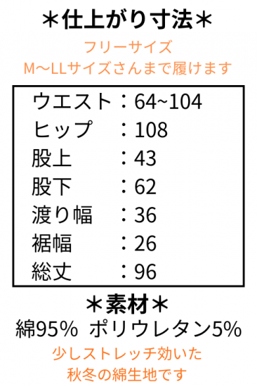 ウエスト:64~104 ヒップ:108 股上:43 股下:62 渡り幅:36 裾幅:26 総丈:96
