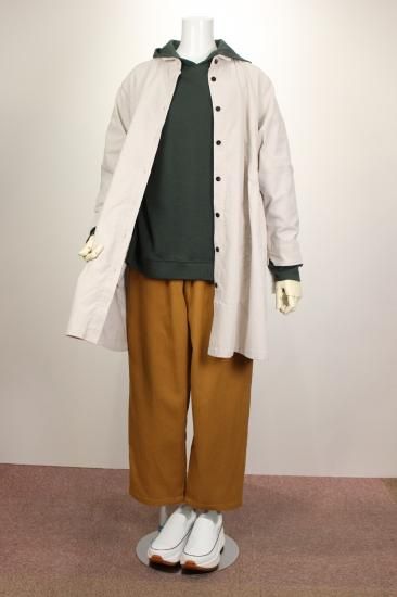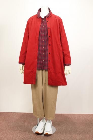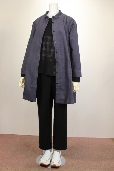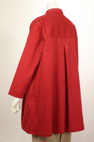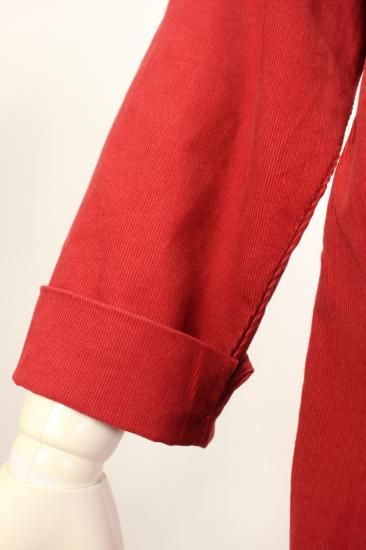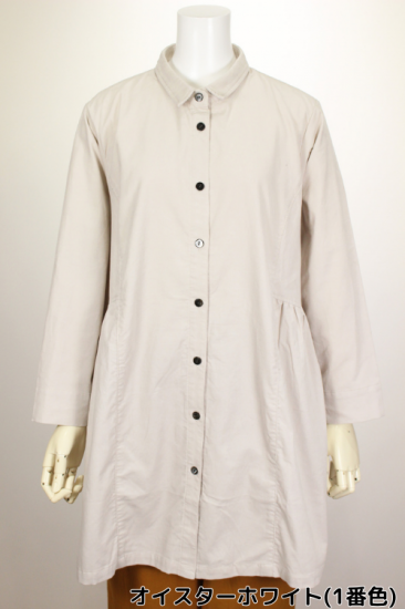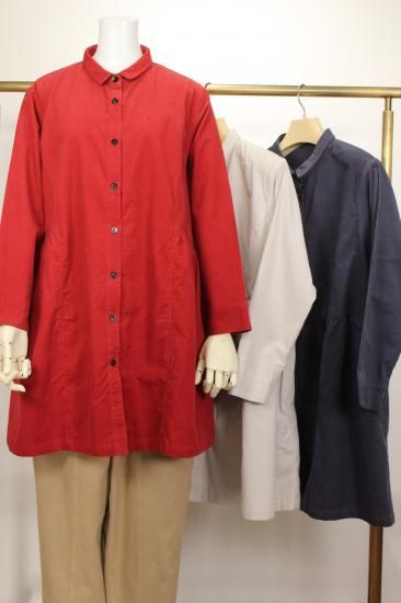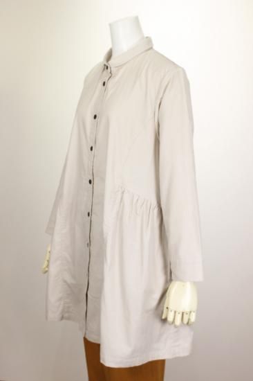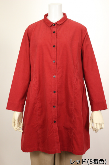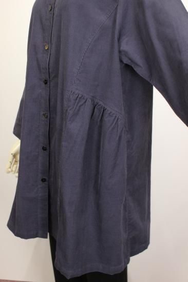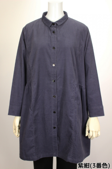 ぬくもり感じる細コーデュロイの丈長ブラウス。一枚着にも、羽織コーデにも役立ちます。ウエスト脇部分のギャザーと切替がスッキリ見えのポイントです。