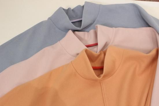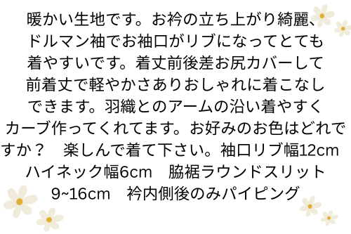 暖かい生地です。お衿の立ち上がり綺麗、ドルマン袖でお袖口がリブになってとても着やすいです。着丈前後差お尻カバーして前着丈で軽やかさありおしゃれに着こなしできます。羽織とのアームの沿い着やすくカーブ作ってくれてます。お色展開多くしてますのでお好みをお選び下さい。袖口リブ幅12cm ハイネック幅6cm 脇裾ラウンドスリット9~16cm 衿内側後のみパイピング