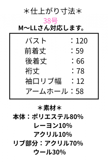 *仕上がり寸法*バスト120 着丈前59後66 裄丈78 袖口幅8 アームホール58