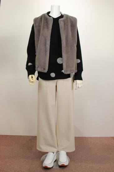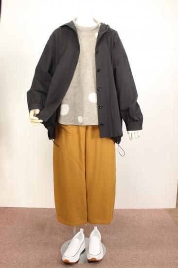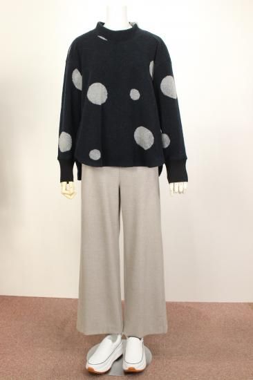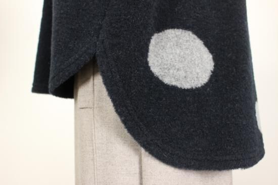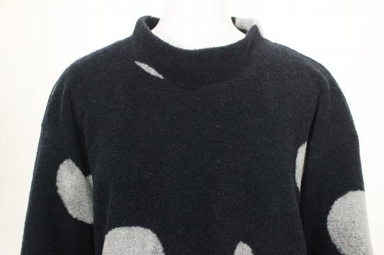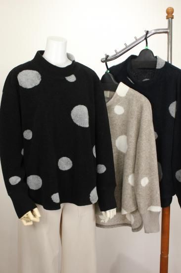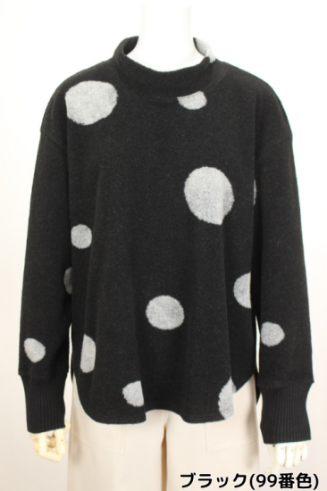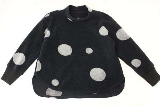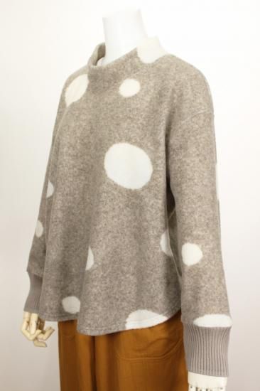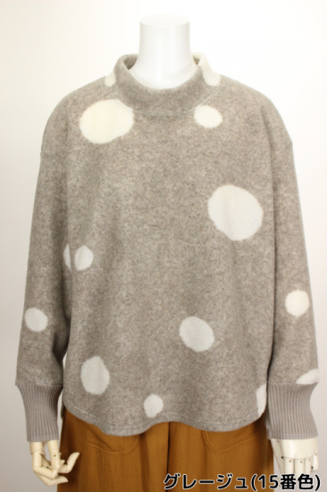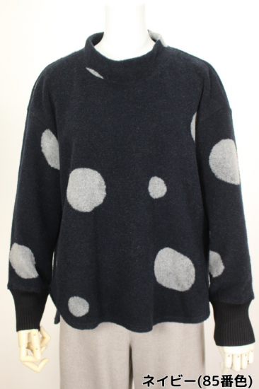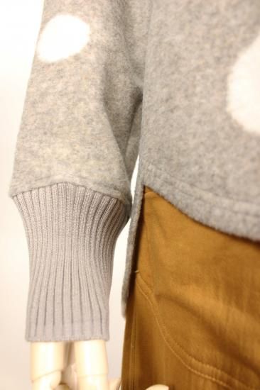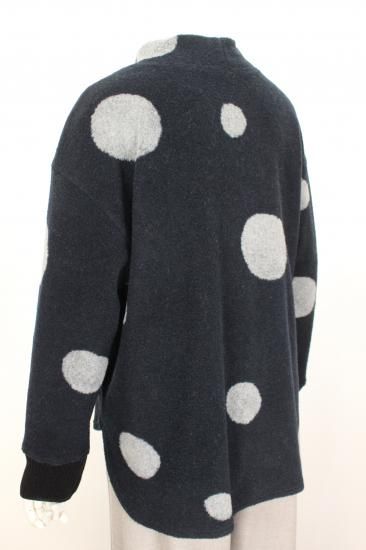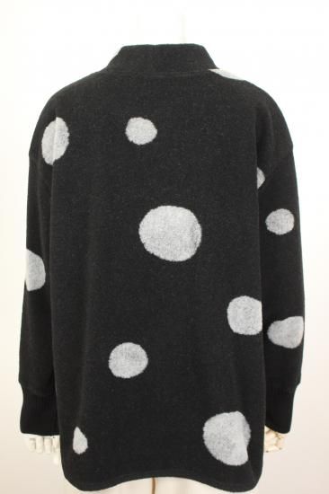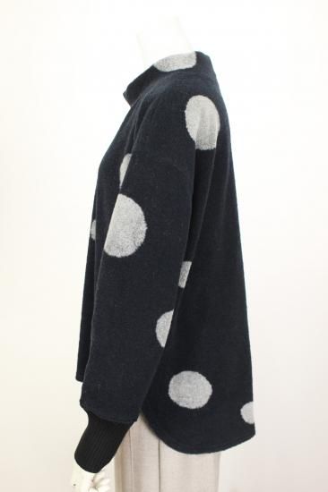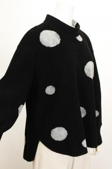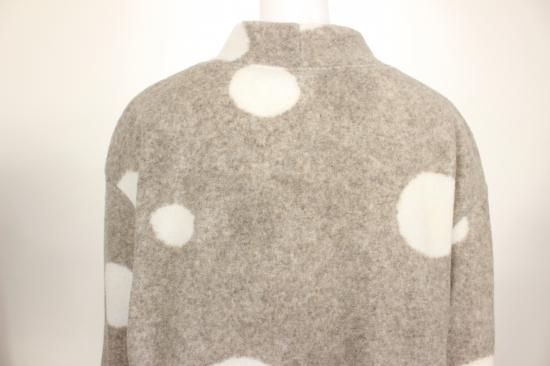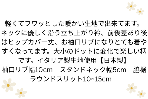 軽くてフワッとした暖かい生地で出来てます。ネックに優しく沿う立ち上がり衿、前後差ありお袖口リブになりとても着やすくなってます。大小のドットに変化あり楽しい柄です。イタリア製生地使用【日本製】袖口リブ幅10cm スタンドネック幅5cm 脇裾ラウンドスリット10~15cm