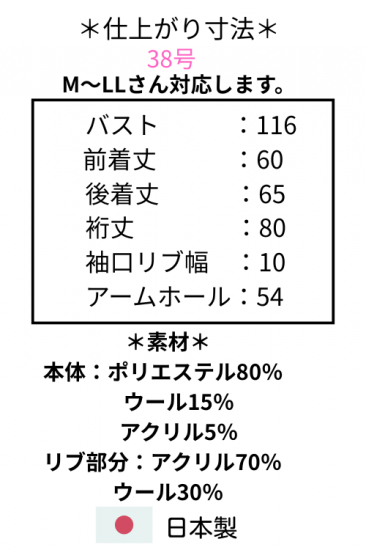 *仕上がり寸法*バスト116 着丈前60後65 肩幅60 袖丈49 袖口幅8~15 アームホール54