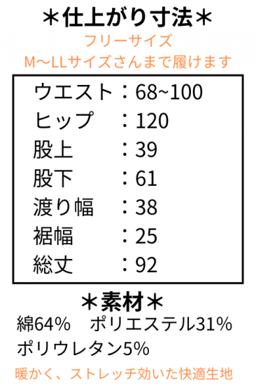 ウエスト68~100 ヒップ120 股上39 股下61 渡り幅38 裾幅25 総丈92