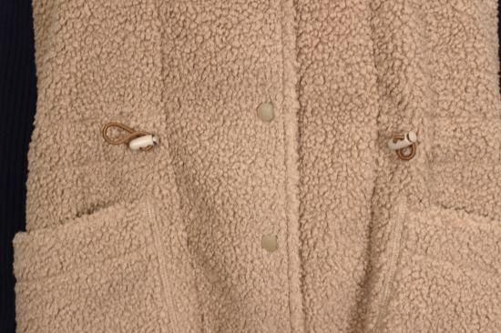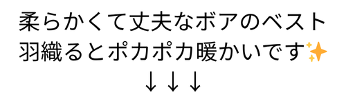 丈夫で柔らかいボアベスト。羽織るとポカポカ暖かいです。丈長でお尻周りまでしっかりカバーして冷やしません。モコモコした可愛らしさをコーデにプラスできます。スタンドネックはお首周りも暖かいです。