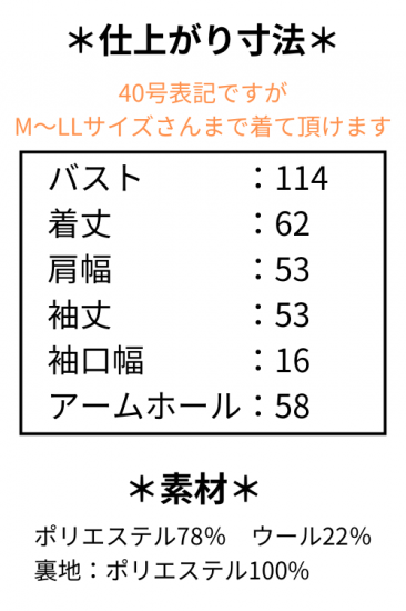 バスト114 着丈62 肩幅53 袖丈53 袖口幅16 アームホール58