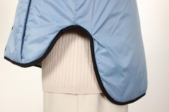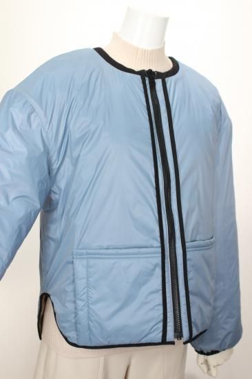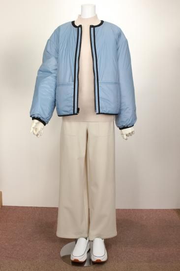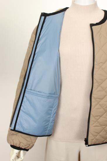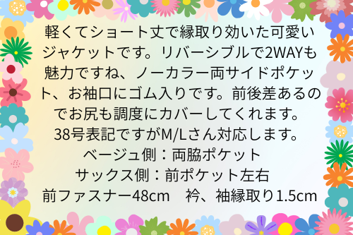 軽くてショート丈で縁取り効いた可愛いジャケットです。リバーシブルで2WAYも魅力ですね、ノーカラー両サイドポケット、お袖口にゴム入りです。前後差あるのでお尻も調度にカバーしてくれます。38号表記ですがM/Lさん対応します。ベージュ側:両脇ポケット サックス側:前ポケット左右 前ファスナー48cm 衿、袖縁取り1.5cm