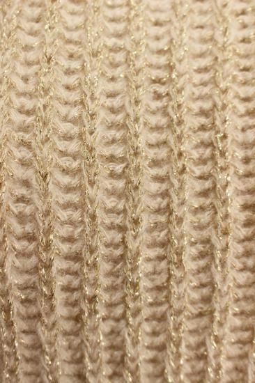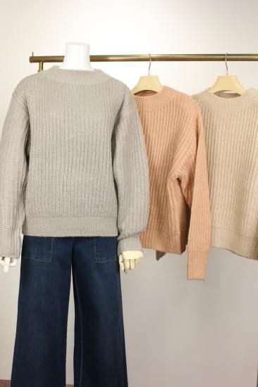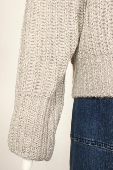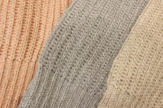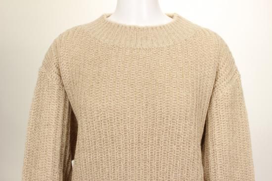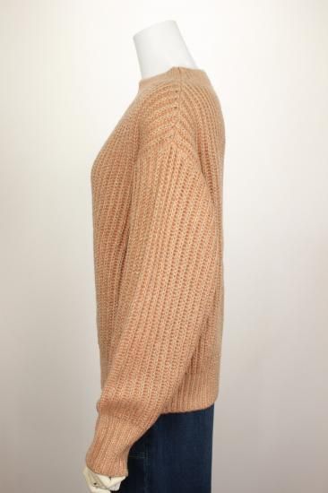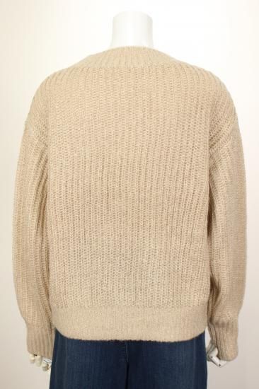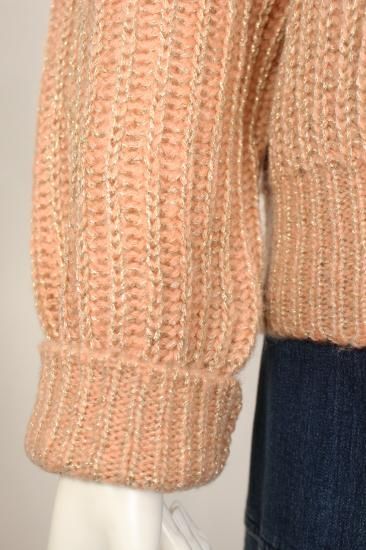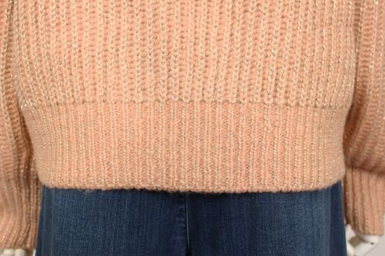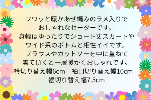 フワッと暖かあぜ編みのラメ入りでおしゃれなセーターです。身幅はゆったりでショート丈スカートやワイド系のボトムと相性イイです。ブラウスやカットソーを中に重ねて着て頂くと一層暖かくおしゃれです。衿切り替え幅6cm 袖口切り替え幅10cm 裾切り替え幅7.5cm