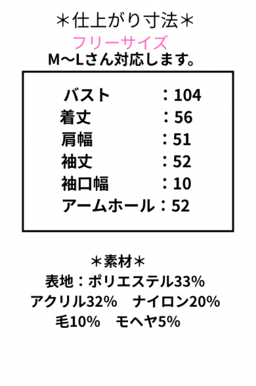 *仕上がり寸法*バスト104 着丈56 肩幅51 袖丈52 袖口幅10 アームホール52