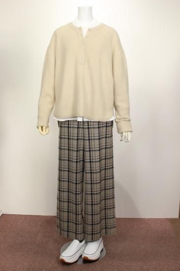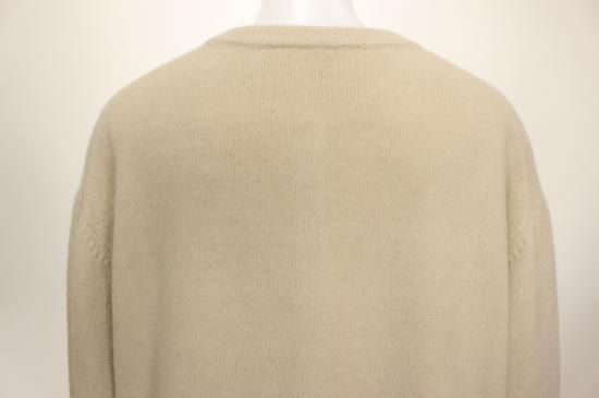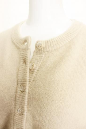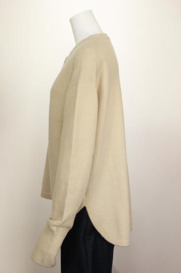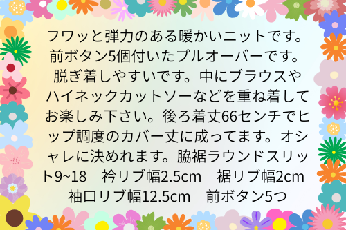 フワッと弾力のある暖かいニットです。前ボタン5個付いたプルオーバーです。脱ぎ着しやすいです。中にブラウスやハイネックカットソーなどを重ね着してお楽しみ下さい。後ろ着丈66センチでヒップ調度のカバー丈に成ってます。オシャレに決めれます。脇裾ラウンドスリット9~18 衿リブ幅2.5cm 裾リブ幅2cm 袖口リブ幅12.5cm 前ボタン5つ